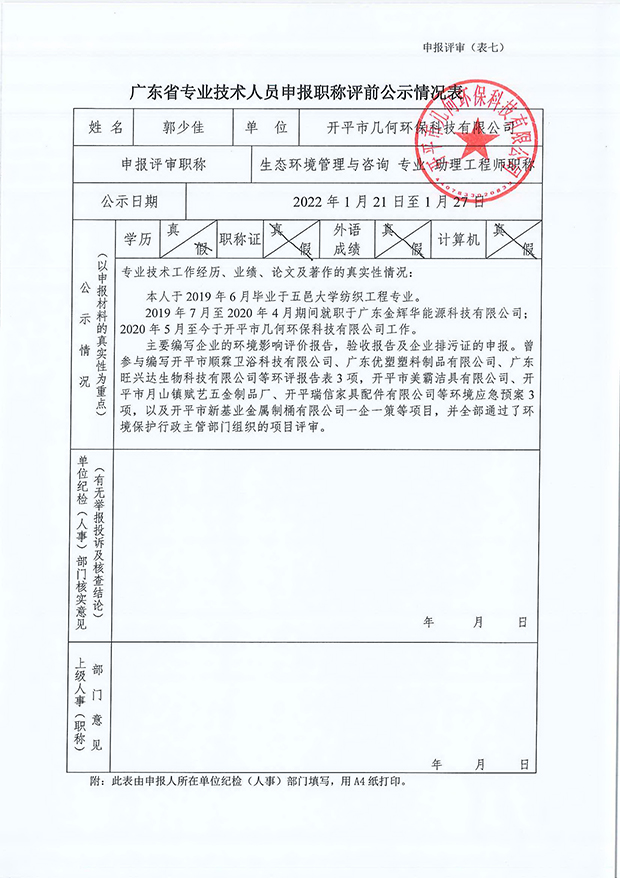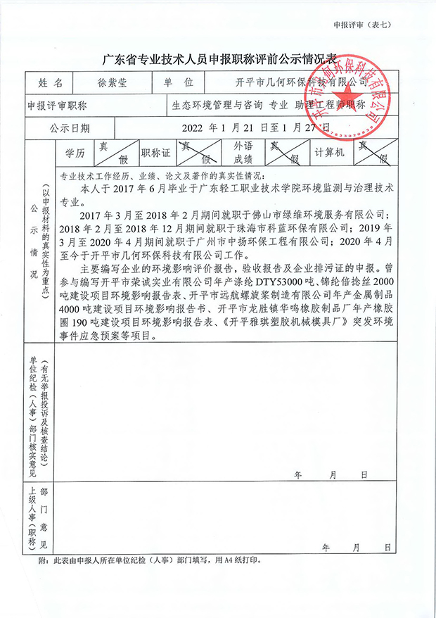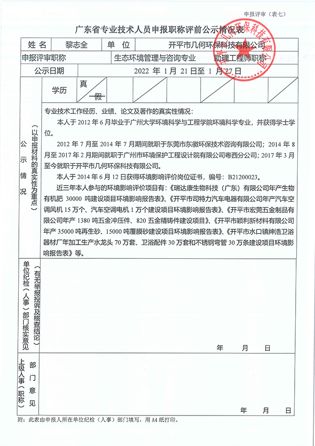 開(kāi)平市幾何環(huán)??萍加邢薰炯夹g(shù)人員申報(bào)職稱(chēng)評(píng)前公示